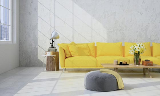 - الأصفر: يشيع المرح والنشاط عند استخدامه في غرف الجلوس. وفي هذا الإطار، يُنصح باختيار كراس مطلية بالأصفر الحارّ أو كنبات ذات قماش أصفر. علمًا بأنه يحتاج إلى إضاءة بيضاء. ولكن، يجدر عدم طلاء الجدران به. وبالمقابل، يُستخدم الأصفر الذي يُخفّف بالأبيض، ويُطلق خبراء الديكور عليه إسم "الأصفر البارد"، في طلاء الجدران به ويُستخدم في جميع غرف المنزل، وهو يتناسق مع الألوان الأخرى.
