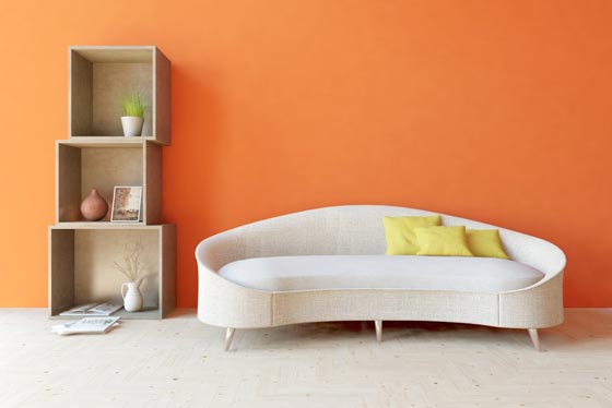 - البرتقالي: يُخلّص من التوتر، ويجمع بين الطاقة الجسدية الممتدة من الأحمر، والطاقة الفكرية المستقاة من الأصفر، ويرمز إلى التواضع والسعادة والحب، في اليابان. وهو يُناسب جدران غرفة المعيشة الفسيحة، وتحديدًا تدرجات المشمش الفاتح أو الدراق منه، أو عند مزج الأبيض مع أرائك برتقاليّة اللون. ويُنصح باستخدامه أيضًا، في غرف الأطفال. وهو مثالي مع الأبيض والأسود.