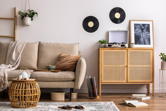 - الراتان: يُدمج الأثاث الراتان، بطرق مختلفة، في المنزل المعاصر، علمًا أن الخامة كانت شائعة، في سبعينيات القرن الماضي.