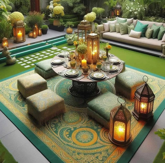 إنشاء مجلس فخم، أو مساحة جلوس مليئة بالوسائد الأرضية المريحة والسجاد الفاخر والطاولات الجانبية المميزة، من شأنه أن يعزز بشكل كبير الأجواء الاحتفالية، وستوفر هذه المساحة المريحة منطقة ترحيبية للعائلة والزوار، للجلوس والانخراط في المحادثات، والمشاركة في احتفالات العيد المبهجة.