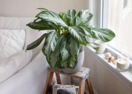 يعرف نبات الخضرة الصيني أيضا باسم أجلونيما، وهو اختيار رائع إذا كنت تبحث عن نبات منزلي خال من المتاعب، بشرط اتباع ظروف النمو المناسبة، ويحتاج فقط إلى الري كل 5 إلى 10 أيام (احترس من التربة الرطبة) وأشعة الشمس غير المباشرة المنخفضة إلى الساطعة للحفاظ على سلامته، ويمكنك العثور على أصناف ذات أوراق خضراء مزينة بخطوط جريئة تتراوح من الفضي إلى الأحمر، وهذا النبات سام للقطط والكلاب، ولكنه من أفضل النباتات المنزلية الرائعة.