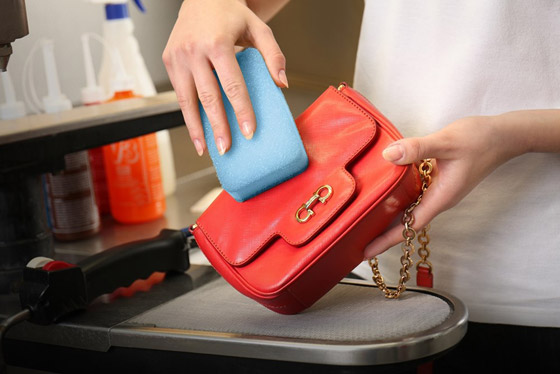 - لمزيد من اللمعان، ولتلميع العلامات، ضعي منظف الجلد اللامع برفق.