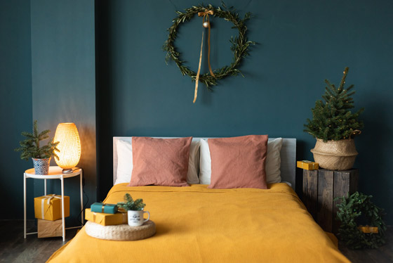 غرفة نوم دافئة، ومزينة لمناسبة نهاية العام
