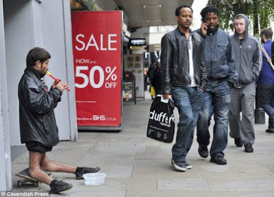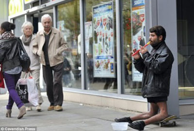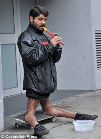 في شوارع مدينة مانشستر البريطانية، اصبح منظر هذا المشرد الروماني من مدينة تمشوارة مألوفا لدى الناس الذين يساعدونه بالطعام وبعض النقود ايضا. الروماني الذي يدعى فلورينل وعمره 25 عاما متزوج في رومانيا ولديه طفلين تركهما وراءه لكي يبحث عن علاج لركبتيه اللتان جاءتا بهذا الانثناء المرضي منذ الولادة.