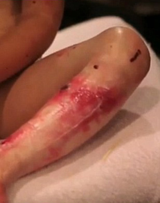 كما وانها لا تستطيع الاستحمام بالدش العادي، وذلك لان وقع المياه على جلدها يؤذيها، وايضا بسبب الضمادات والمراهم الني تضعها على رجليها وهي الجزء الاكثر تضررا في جسمها.
