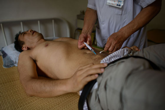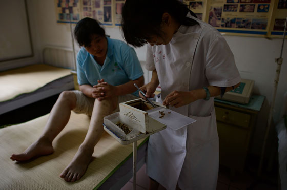 ويشرح وانغ منغلن في عيادته الواقعة في ضواحي بكين (نمسك النحلة باصبعين ونضغط برأسها على نقطة معينة من الجسم حتى تخرج إبرتها). ويوضح أن النحل المستخدم مستورد من إيطاليا، وهو ينفق بعد استخدامه. وما من أدلة طبية رسمية على فعالية سم النحل في معالجة الأمراض.