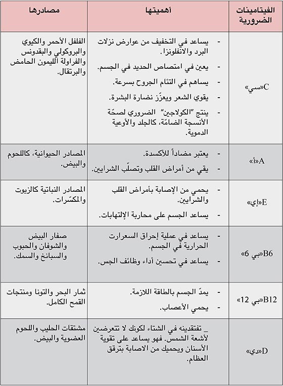 يعتبر فيروس الانفلونزا ضيف الشتاء الدائم، ولذا قد تكون الفيتامينات المستمدّة من الطعام الصحي الدواء الشافي لك إن أصبت به، في خلال هذا الفصل. وتعتبر الفيتامينات ضرورية لنمو الإنسان، وتساهم في عمليّة إحراق السعرات الحراريّة في الجسم. والجدير بالذكر أن المتقدمين في السنّ ومن يتتبعون حميات صارمة هم الأكثر عرضة لنقص الفيتامينات في أجسامهم لكونهم يعانون من مشكلة الهضم وفقد الشهية. اليكم قائمة بأبرز الفيتامينات الضرورية التي يحتاج اليها جسمك في الشتاء وعن مصادرها الرئيسة: