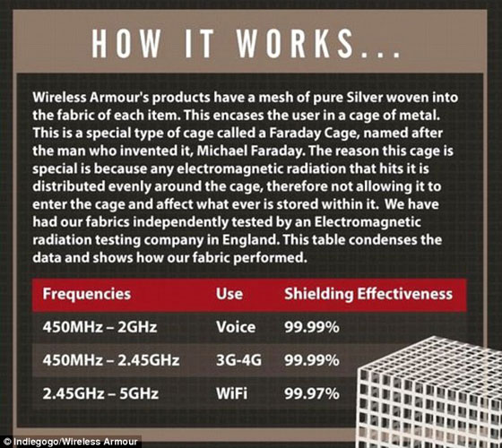 صنع طبيب بريطاني ملابس داخلية مبطنة بالفضة تعمل كـ"قفص" لحماية الأعضاء التناسلية الرجالية والفخذين من إشعاعات الهاتف الضارة والتي قد تسبب العقم أو انخفاض عدد الحيوانات المنوية. خيوط الفضة الموجودة منسوجة داخل الملابس الداخلية بشكل جيد لتمنع وصول الأشعة الضارة من الهاتف أو الجهاز اللوحي، وتعتمد الفكرة على منع الإلكترونات من الوصول إلى الجسم لأن القطن المصنوع منه الملابس ممزوج بخيوط رفيعة من الفضة تصل نسبتها إلى 20 % في كل قطعة، ما يجعلها مقاومة للبكتيريا والميكروبات وكذلك الإشعاعات، وفقاً لما ذكرته صحيفة "ديلي ميل" البريطانية.