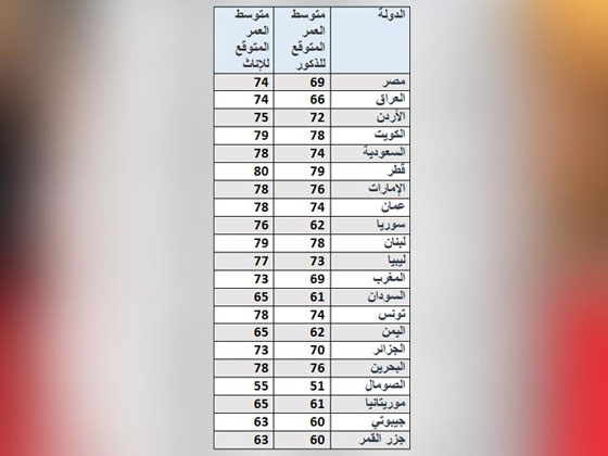 متوسط أعمار الرجال والنساء المتوقع في البلدان العربية
