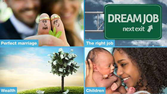 أ) الزواج المثالي، ب) الثروة، ج) الأطفال، د) الوظيفة المثالية لن تجلب أي من هذه الأمور السعادة، فبحسب باحثة السعادة سونيا ليوبوميرسكي، قد تساهم بهذا الشعور، لكنها تمثل جزءاً مما يسمى بـ "خرافات السعادة". وعرّفت ليوبوميرسكي هذه "الخرافات" بتلك التي تشعرنا بالبهجة لأننا قمنا بإنجاز أمور معينة معروفة اجتماعياً على أنها أدلة النجاح. وتؤدي هذه النظرة الضيقة للسعادة إلى إعاقتنا عن رؤية الإيجابيات في أي تغيير سلبي قد يطرأ علينا، وتمنعنا من فهم قدرتنا الكامنة للنمو.