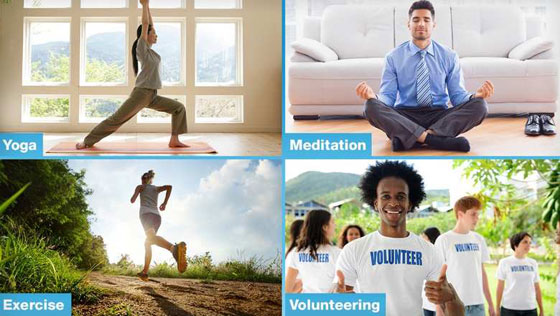 أ) اليوغا، ب) التأمل، ج) ممارسة الرياضة، د) الأعمال التطوعية جميع هذه النشاطات تساعد في الشعور بالسعادة. فبحسب الطبيب المختص في شؤون السعادة ريتشارد ديفدسون، إذا جلس الشخص بهدوء وفكر بالتعاطف مع الغير واللطف لمدة نصف ساعة يومياً، سيبدو على دماغه تغييرات واضحة في غضون أسبوعين.