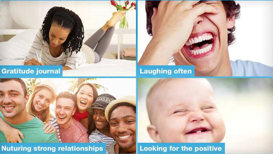 أ) الضحك، ب) تكوين روابط اجتماعية قوية، ج) كتابة الأمور التي تشعرك بالامتنان، د) التركيز على الجانب الإيجابي جميع هذه النشاطات تؤدي إلى الشعور بالسعادة. فبحسب دراسات، فإن كتابة الأمور التي تشعرنا بالامتنان لأكثر من مرة في الأسبوع، والضحك، وإحاطة أنفسنا بعلاقات إيجابية، والتركيز على الجوانب الإيجابية في كل المواقف هي طرق ممتازة لتحسين الشعور العام.