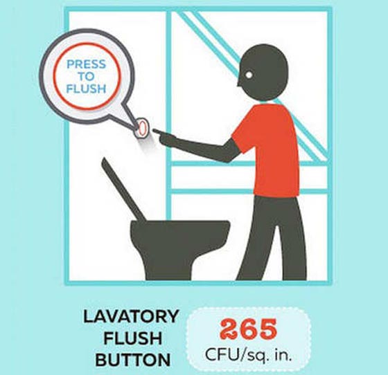 زر دافق المرحاض يحتوي على 265 مستعمرة من البكتيريا لكل إنش مربع.