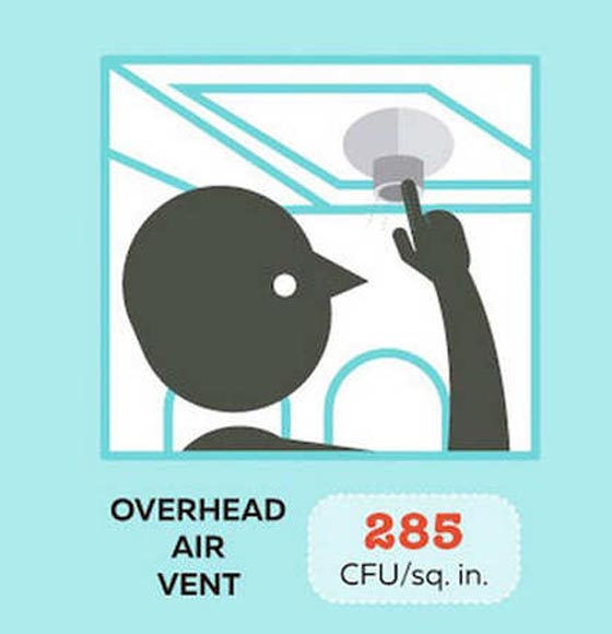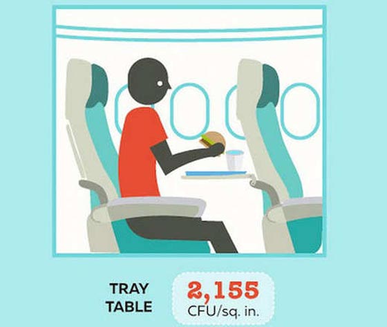 قد يكون تحديد المكان الذي تتكاثر فيه البكتيريا والجراثيم على متن الطائرة أمراً صعباً. لذا، عمد احد المواقع الصحية إلى ارسال عالم أحياء دقيقة لأخذ 26 عينة من مطارات أمريكية وطائرات مختلفة. وأظهرت النتائج أن المرحاض لم يكن من بين أبرز الأماكن لتكاثر البكتيريا. لذا، تعرف إلى ستة من أكثر الأشياء التي تنتشر فيها البكتيريا على متن الطائرات.