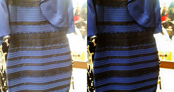 وكان الفستان الذي صممته دار "Roman" البريطانية للأزياء قد سبب الكثير من الحيرة بعد ان تم نشر صورته عبر موقع التواصل الإجتماعي "تويتر" في فبراير/شباط الماضي، وأثبتت دار الأزياء أنه كان باللون الأزرق مع الدانتيل الأسود. وذهبت تفسيرات العلماء في البداية إلى أن رؤية الفستان باللونين الأبيض والذهبي تعود إلى أن الضوء يدخل إلى العين من خلال العدسات، ويختلف طول موجات الضوء التي تقع على عدسة العين باختلاف الألوان نفسها، بعدها يضرب الضوء الشبكية في الجزء الخلفي من العين، فتثير أصباغ الألوان الوصلات العصبية الممتدة إلى القشرة الدماغية التي تعالج هذه الإشارات وتحولها إلى صور وألوان.