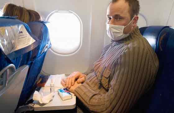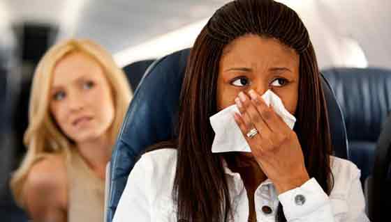 1 - احتمالات الاصابة بالزكام: ليس هناك ما هو أكثر إزعاجا أثناء السفر جوا من الجلوس بجانب مسافر يعطس ويسعل في حيز مكتظ على امتداد ساعات. وتوصلت دراسة أخيرة الى ان احتمالات الاصابة بالزكام تزيد أكثر من 100 مرة أثناء السفر جوا. ويقول الخبير الصحي الدكتور ريتشارد داود ان الجو الخالي من أي رطوبة عمليا داخل الطائرة يزيد تعرض المسافر الى العدوى المحمولة جوا ويكون المسافر أكثر تعرضا للزكام وعدوى الجهاز التنفسي والفيروسات التي تنتعش في ظروف الرطوبة المنخفضة. وأشار الدكتور داود الى ان امراضاً خطيرة مثل التدرن الرئوي انتشرت عن طريق السعال داخل الطائرة في بعض الحالات المعروفة.