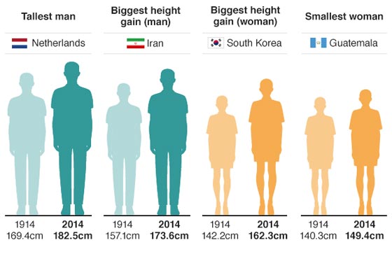 وكشفت الدراسة أيضا أن الرجال الهولنديين هم الأطول على مستوى العالم بمتوسط طول 182.5 سنتيمتر وأن النساء اللاتفيات هن الأطول بمتوسط طول 170 سنتيمتر. وتبين أيضا أن رجال تيمور الشرقية (دولة تقع في جنوب شرق آسيا) كانوا الأقصر على مستوى العالم في عام 2014 بمتوسط طول 160 سنتيمتر وأن نساء جواتيمالا كن الأقصر في نفس العام بمتوسط طول 149 سنتيمتر.