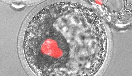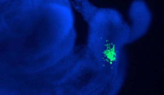 تظهر هذه الصورة المجهرية خلايا جذعية محفزة من صنع الإنسان، باللون الأحمر، مدموجة داخل جنين خنزير. ويأمل العلماء أن هذه الخلايا البشرية يمكن تسخيرها لصنع أعضاء لمرضى العمليات الزراعية يوماً ما
