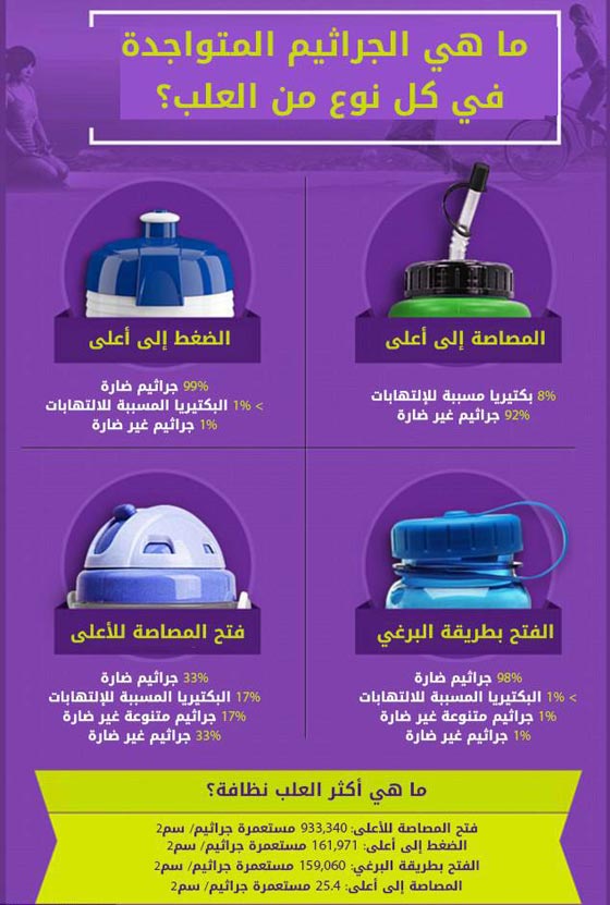 وشملت الدراسة إجراء فحوصات على 12 نوعا من العلب البلاستيكية التي تعاد تعبئتها بالماء والمستخدمة بالاخص من قبل الرياضيين، فتوصلت النتائج إلى أن العديد من البكتيريا يفضل العيش في بيئة رطبة وهو بالتالي يتواجد بشكل كبير في اغطية العلب البلاستيكية والمصاصات الخاصة بها.