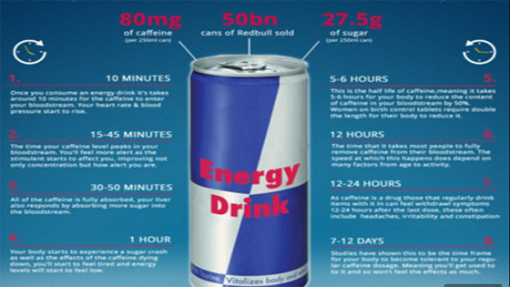على الرغم من انتشار التحذيرات الصحية تجاه شرب مشروبات الطاقة، يستمر الكثير من الأشخاص في تناول هذه المشروبات بشكل يومي ظنا منهم أنها مفيدة وتعطي طاقة عالية للجسم. ولكننا بطبيعة الحال لا نعلم الأثر الحقيقي لمشروبات الطاقة على أجسادنا كمثل مشروب ريد بول. وفي ما يلي دليل واضح يحدد أثر مشروبات الطاقة على جسم الإنسان على مراحل، بعد 10 دقائق وبعد مرور ساعتين وبمضي 12 يوما على الانتهاء من شرب عبوة واحدة فقط.