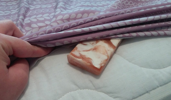 1- يتم وضع قطعة الصابون أسفل غطاء السرير عند المنطقة التي تضع فيها قدميك أو بجوار المكان المصاب.