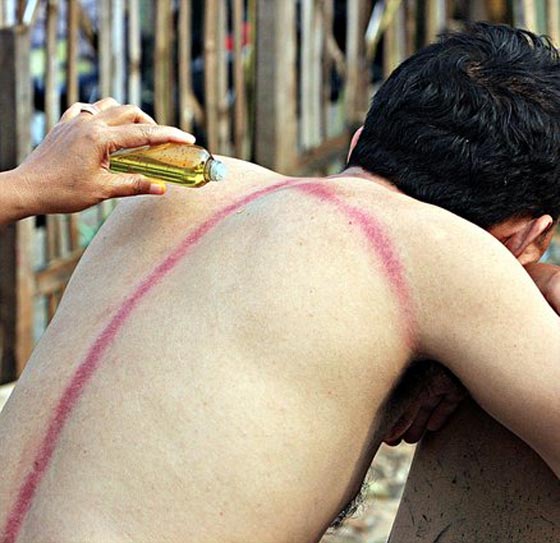 طريقة العلاج تلك، المعروفة باسم "كيروكان" باللغة المحلية، تهدف إلى التخلص من التشنجات في منطقتي الرقبة والظهر وإراحة المريض. وتتم عبر دهن زيت جوز الهند في منطقة الرقبة والظهر، ورسم خطوط في تلك المنطقتين عبر النقود المعدنية تترك لوناً أحمر، من أجل تمكين الزيت من التأثير بشكل أكبر على الجلد.