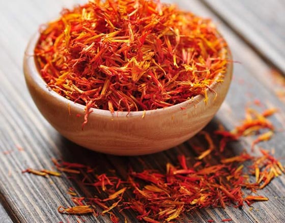 الزعفران: هو أشهر التوابل الملونة، ويُعرف أيضاً بمذاقه الجيد، كما أن لديه فعالية قوية كمضاد للاكتئاب، ما يحول دون امتصاص المواد المسببة للتوتر، ويوصى به أيضاً في حالة الاضطرابات النفسية والرغبة الجنسية. ولكن، يجب عدم استهلاكه في حالة الحمل، لأنه قد يكون سبباً في حالات الإجهاض وتقلصات الرحم.