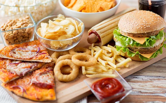 - الأطعمة السريعة: وهي تضم الكثير من السكر والدهون المتحولة منها والمشبعة، وتفتقر الى الفيتامينات، ما يجعل منها قنبلة مولّدة للشوارد الكيماوية الضارة المثيرة للأمراض المرتبطة بالشيخوخة، مثل داء الزهايمر وداء اللطاخة الصفراء في العين وسرطان الجلد والداء السكري.