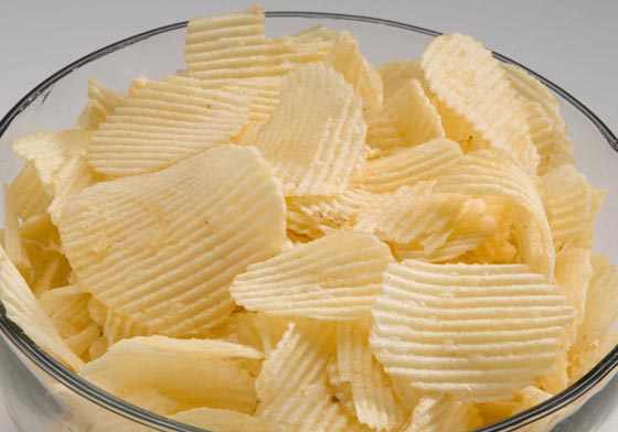 - رقائق البطاطا او التشيبس: وهي ترفع نسبة سكر الفواكه في الدم الذي اتضح للعلماء أنه يسرّع عملية الشيخوخة. أيضاً يحتوي الشيبس على مادة الأكريلاميد والدهون المشبعة التي تحرّض على الإصابة بالسرطان.