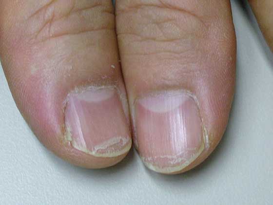 - مرض الحزاز المسطح: وتعتبر الأظافر الرفيعة والمشققة والخشنة دليلاً على هذا المرض، وفي بعض الحالات يتآكل الظفر وينفصل عن مرقده.