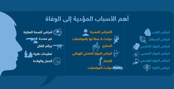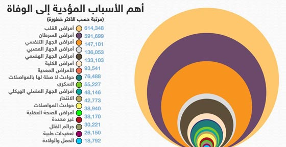 وبحسب هذا الأطلس، كما يتضح أيضا من الإنفوغرافيك المرفق، فإن السبب الأول في وفاة الإنسان هو أمراض القلب المختلفة، ويليه أمراض السرطان ثم أمراض الجهاز التنفسي فالعصبي والهضمي. وتبين الأرقام المرفقة، الصادرة عن التقرير الإحصائي الحيوي الوطني الأميركي، فرقا واضحا بين ضحايا أمراض القلب وبقية الأمراض. ولا شك أن هذه النتيجة تشير بوضوح إلى ن مخاوفنا غالبا ما تكون في غير محلها، وأن علينا أن نخشى من السيجارة والتدخين أكثر من أي شيء آخر وأن نتناول طعاما صحيا وطازجا يحتوي على الكثير من الخضراوات بدلا من أن نخشى من الموت قتلا أو بحادث سيارة أو غير ذلك من أسباب.