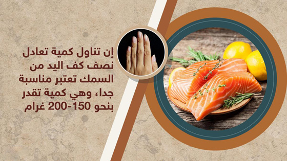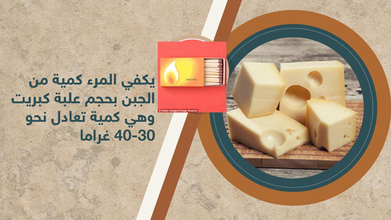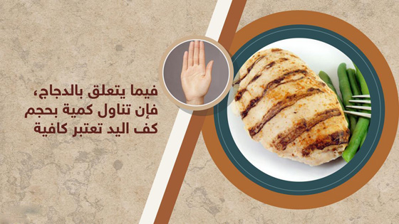على سبيل المثال، فإن كمية من الجبن بحجم علبة الكبريت تعادل ما بين 30 إلى 40 غرام، وهي كمية كافية لما يجب أن يحصل عليه المرء من السعرات الحرارية لهذا الصنف من الطعام. أما فيما يتعلق بالدجاج، فإن تناول كمية بحجم كف اليد تعتبر كافية، في حين أن كمية تعادل نصف كف اليد من السمك تعتبر مناسبة جدا، وهذه الكمية تقدر بحوالي 150 إلى 200 غرام.