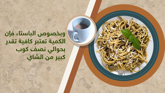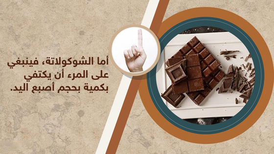 وبخصوص الباستا (المعكرونة)، فإن الكمية الكافية تقدر بحوالي نصف كأس، بينما يجب ألا تتجاوز كمية القهوة بالحليب حجم كرة المضرب، وهذا الحجم يعني كمية تعادل ما بين 40 إلى 60 سعرة حرارية. أما الشوكولاتة فينبغي على المرء أن يكتفي بكمية بحجم أصبع اليد، في حين يفضل ألا تتجاوز كمية الخبز حجم "دفتر ملاحظات". وللمرء أن يأكل الكمية التي يريدها من سلطة الخضراوات نظرا للفائدة التي تحتويها.