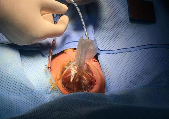 وقرر الجراحون بمستشفى "غلينفيلد" في ليسيستر إجراء الجراحة فور ولادتها، بالرغم من أن نسبة نجاح الجراحة لم تتعد الـ10%، إلا أن الأم تمسكت حتى بالأمل الضعيف. والجراحة تكونت من 3 عمليات دقيقة لنقل القلب داخل تجويف الصدر، بعد وضع قفص صدري صناعي، في سابقة تعد الأولى من نوعها في مجال الجراحة ببريطانيا.