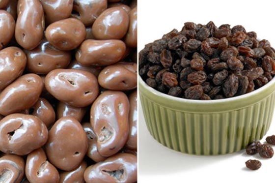الزبيب مع الشوكولاتة: قد يكون من الأشياء المفضلة للبعض، فهو يضاف إلى الكعك أو يمكن تناوله مع الشكولاته فقط. لكنه يؤدي إلى التسوس أيضاً. فالزبيب نفسه يحتوى على كمية سكر عالية فضلاً عن التصاقه بالأسنان. والشكولاته أيضاً تحتوى على نسبة كبيرة من السكر.