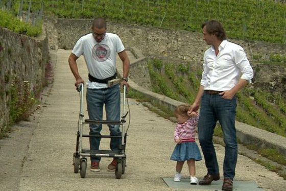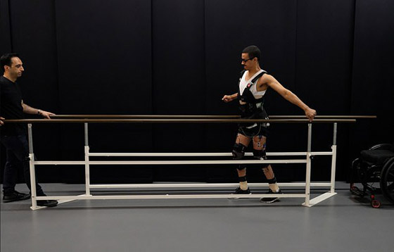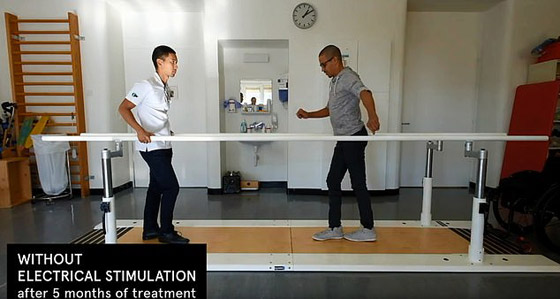 وتم الدخول إلى العيادة التي يعالج فيها المرضى الثلاثة، وأولهم السويسري، ديفيد مزي، البالغ من العمر 30 عاما، والذي يعاني منذ 7 أعوام من إصابة في العمود الفقري بعد حادث مرور. وأكد الطبيب الذي عالج ديفيد بعد الحادث أنه لن يقدر على المشي مجددا. لكن الجهاز الكهربائي، الذي صممه فريق من الباحثين في المدرسة المتعددة التقنيات في لوزان، جعله يمشي أكثر من ميل واحد.