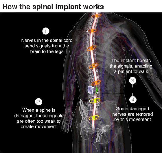 تمكن ثلاثة رجال من المشي مجددا بعد سنوات من الشلل قضوها على الكرسي المتحرك بفضل جراحة في العمود الفقري أجراها لهم أطباء سويسريون. وثبت الأطباء جهازا كهربائيا حول العمود الفقري لكل مريض يقوي الإشارات التي يرسلها الدماغ إلى الأرجل. وساعد الجهاز على ترميم الأعصاب المعطوبة في النخاع الشوكي. ويعتقد الباحثون أن هذا الفتح الطبي سيمكن بعض المصابين بالشلل من استعادة قدرتهم على التحرك دون مساعدة.