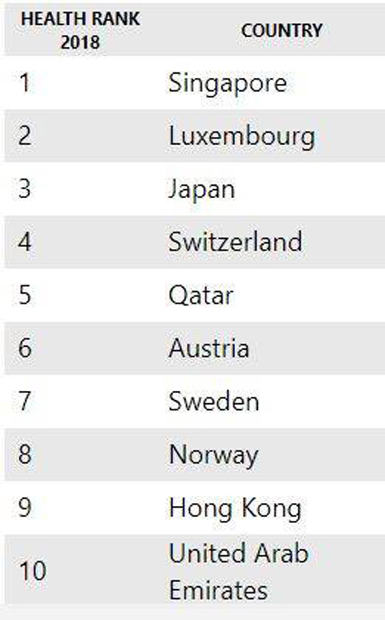 كشف جدول دوري عالمي حول مستوى الصحة في بلدان العالم تضمن 149 دولة عن نتائج وصفتها وسائل الإعلام بالصادمة، حيث وضع الكثير من الدول المتقدمة في مستويات بعيدة عن رأس القائمة. وأظهرت دراسة معهد Legatum التي اعتمدها الجدول أن المملكة المتحدة والولايات المتحدة وأستراليا، لم تظهر ضمن المراكز العشرة الأولى والتي كان أقربها إلى رأس القائمة أستراليا التي جاءت في المرتبة 12.