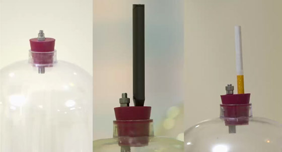 واستخدم علماء قطع من القطن وضعت داخل 3 عبوات زجاجية مغلقة، وقاموا بتعريض القطن للسجائر، فيما استخدموا السجائر الإلكترونية للعبوة الثانية، وتركوا العبوة الثالثة من دون تعرضيها لأي نوع من السجائر. وجاءت النتائج متباعدة جدا، حيث تلوثت قطع القطن التي "استنشقت" السجائر العادية، وتعرضت لتغيير كبير في اللون حتى أصبحت بنية تماما، كما التصقت مادة "القطران" في الأنبوب بطريقة لزجة.