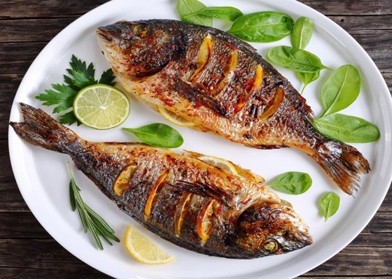 2. الأسماك: هناك أنواع كثيرة من الأسماك غنية بالحمض الدهني أوميغا 3. وتتمتع هذه المادة بتأثير قوي مضاداً للالتهابات يساعد القلب والعقل على البقاء بصحة جيدة، وكذلك شبكية العين. ويوصى بتناول حصتين على الأقل من أسماك المياه الباردة في الأسبوع، وتعتبر أنواع السلمون والسردين والرنجة من أهم مصادر أوميغا 3، كما يعد سمك الهلبوت وسمك التونة من المصادر الجيدة أيضاً.