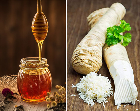 6. الفجل الحار والعسل: هل تمتلك بعض الفجل الحار في المنزل؟ امزج ملعقة كبيرة من الفجل الحار النقي مع ملعقة صغيرة من العسل وأخرى من القرنفل المطحون. أضف المزيج إلى الماء الساخن واشربه (إن استطعت احتماله).