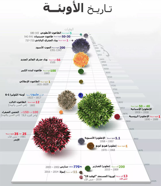 وبحسب تقرير لموقع "إم بي إتش أونلاين" للدراسات والأبحاث الطبية، فإن الكوليرا والطاعون والجدري والإنفلونزا، كانت من أكثر الأمراض وحشية في تاريخ البشرية، لا سيما الجدري الذي قتل ما بين 300 مليون إلى 500 مليون شخص على مدار 12 ألف عام.