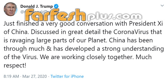 واستطرد موضحا: "كثيرون يسيئون الفهم عندما أقول العودة؛ فهم سيمارسون بقدر ما يستطيعون عدم الاختلاط عن قرب، ويغسلون الأيدي ولا يتصافحون وكل الأشياء التي تحدثنا عنها". وعلى الرغم من تخطي الولايات المتحدة الصين من حيث حالات الإصابة بفيروس كورونا، شكك ترامب في الأرقام المعلن عنها في بكين، قائلا للصحفيين: "أنتم لا تعرفون ما هي الأرقام في الصين".