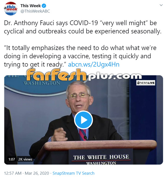حذر أنتوني فوسي، أحد كبار الخبراء في فريق عمل مكافحة فيروس كورونا بأمريكا من أنه حتى في حال نجاح الدول التي تحارب Covid-19 في التغلب عليه، فقد يعود المرض في دورات سنوية. وقال الدكتور فوسي، في حديث مع الصحفيين في البيت الأبيض يوم الأربعاء: "قد يصبح المرض موسميا ودوريا. بدأنا نرى الآن في نصف الكرة الجنوبي والجنوب الإفريقي، أن لدينا حالات تظهر أثناء دخول موسم الشتاء".