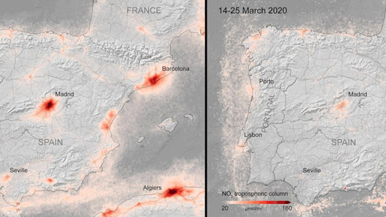 ويتزامن هذا مع الإغلاق في الكثير من الدول الأوروبية التي قيدت النقل على الطرق، الذي يعد أكبر مصدر لأكاسيد النيتروجين، وأبطأت انبعاثات غازات المصانع. وتظهر الصور الجديدة التي نشرتها وكالة الفضاء الأوروبية وحللها التحالف الأوروبي للصحة العامة، وهو منظمة غير ربحية، وجود تغير في كثافة ثاني أكسيد النيتروجين الذي يمكن أن يسبب مشاكل في الجهاز التنفسي والسرطان.
