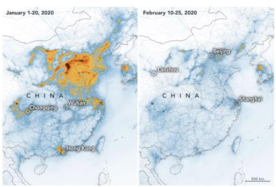 أظهرت صور نشرتها وكالة ناسا انخفاض التلوث فی الصین بسبب کورونا!وهو ما يرجح أن يكون نتيجة لتباطؤ النشاط الاقتصادي بسبب انتشار فيروس كورونا. وأظهرت خرائط ناسا انخفاضاً في مستويات أكسيد النيتروجين في الصين هذا العام. يأتي ذلك وسط تراجع قياسي في نشاط المصانع الصينية، إذ أوقف المصنعون الإنتاج في إطار جهود تستهدف احتواء الفيروس.