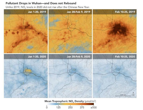 وقالت ناسا إن انخفاض مستويات أكسيد النيتروجين، وهو غاز ضار ينبعث من محركات المركبات والآلات في المنشآت الصناعية، في الصين كان على نطاق أوسع في المناطق القريبة من مركز انتشار الفيروس في ووهان. وأجرت الوكالة الأمريكية مقارنة بين انبعاثات هذا الغاز في أول شهرين من 2019 وفترات أخرى في العام الجاري.