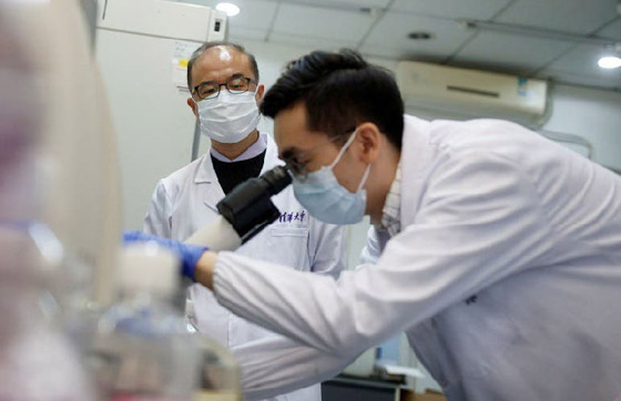 الخبير زانغ (واقفا) ينظر الى عالم آخر يدقق بالفيروس عبر المجهر