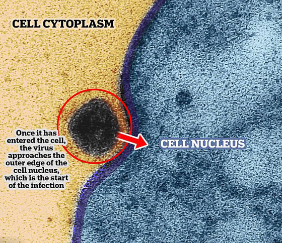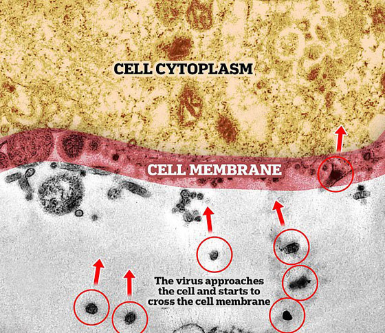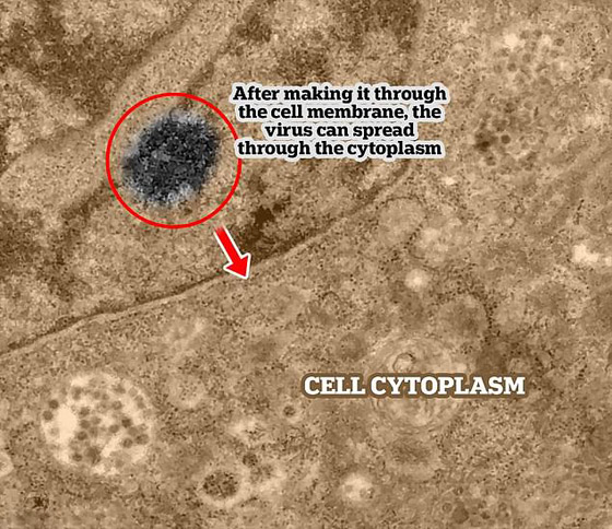وكتب فريق البحث أن "العلماء استخدموا الفيروسات المعزولة من عينات تم جمعها من أنف وحلق مريض مصاب. ثم تُنقل الخلايا المصابة إلى المختبر حيث يتم فحصها تحت المجهر الإلكتروني، لالتقاط لحظة الإصابة". وتظهر البقع الداكنة في الصور التي التقطها الباحثون، فيروس SARS-COV-2.