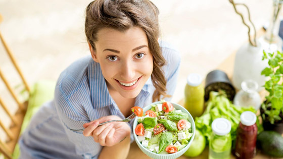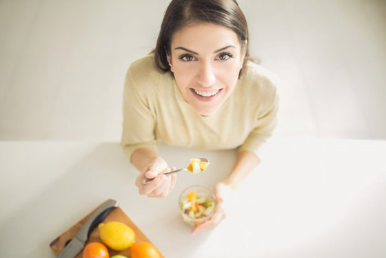 1. تناولي، يوميًّا الأطعمة الطازجة، التي تشمل: الفواكه والخضروات الغنيّة بالفيتامينات "ب" و"ج" و"د" و"هـ"، كالبرتقال والكيوي والفراولة والمانجو والجوافة والبروكولي والخضروات الورقية والفطر والفلفل والطماطم واليقطين والجزر والبطاطا الحلوة والملفوف والقرنبيط. واجعلي الصنوف الغذائيّة الآتية تحلّ على مائدتك، كالبقوليات والحبوب الكاملة (القمح والأرزّ البنّي والشوفان والذرة والكينوا) والمنتجات الغنيّة بالبروتين والخالية من الدهون (الألبان والبيض والدجاج ولحم السمك) والمكسرات النيئة.